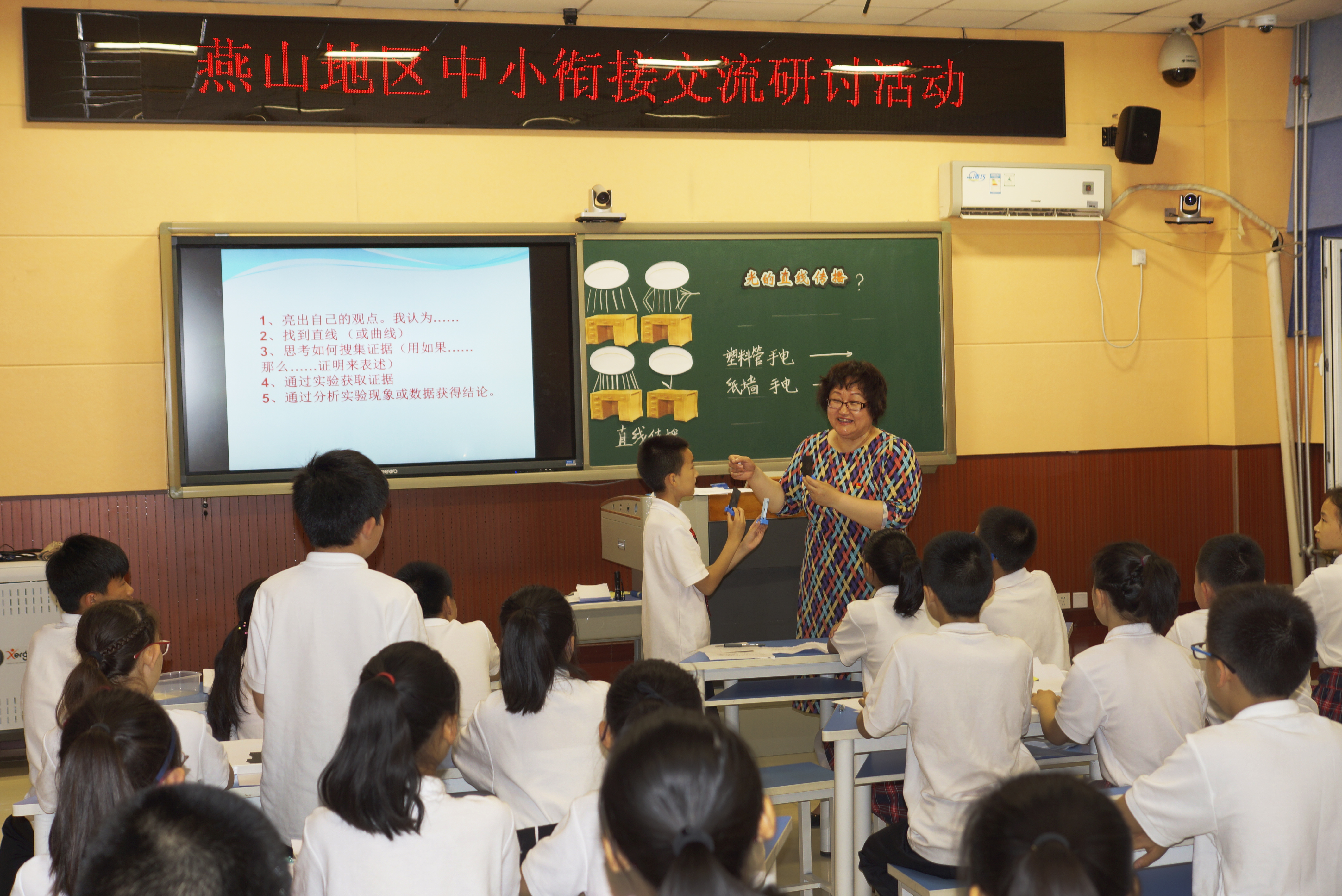 本次研讨活动分三个阶段推进。第一个阶段是“走进课堂”。前进二小刘铁影老师和前进中学田顺达老师分别执教了小学科学课《光的直线传播》、中学语文课《土地的誓言》。常态化的课堂,积极互动的课堂氛围,让代表、委员们了解了课堂教学的形式,对教师如何教、学生如何学,对开放、探究、合作、自主的课堂文化有了一定的认识。第二个阶段是“大会交流”,燕山教委副主任潘淑英以《探索适宜途径,推进中小衔接,促进学生持续发展》为题,抓住“衔接、贯通”两个关键词,对燕山地区实施五四学制改革以来开展的学段衔接和学段、学科贯通工作进行了过程梳理,详实介绍了燕山教育从“基于衔接解决问题到运用贯通理念整体育人”的改革历程以及积累的经验、取得的成绩。同时,就燕山地区积极应对中高考考试、招生制度改革所采取的有效措施和科学的方法进行了简要汇报。前进中学方元校长以《沐浴阳光 幸福成长》为题,围绕“办阳光学校,让生命幸福”的办学理念和关注学生素养提升的目标,重点介绍了学校在“九年一贯 五四分段”教育背景下开发、组织、实施的丰富的校本课程,介绍了学校在“区域联盟 自主发展”衔接机制下开展的关注学生心理成长、习惯养成、能力提高等方面的活动。借助区、校两级汇报,参加活动的代表、委员们对燕山地区的教育优质、特色发展有了更加深刻的认识,增强了对地区贯通培养的理念的认同度。第三个阶段是“走进校园”,代表、委员们一起走进了前进二小,共同欣赏了由二小学生带来的“生命如此蓬勃——蓬勃课程秀”,孩子们用精彩的表演把自己快乐的学习、愉快的活动、幸福的生活呈现在大家面前,赢得了与会者的称赞。随后,大家又在行走间观看了绿色种植、非遗毛猴、梦想航模等多个课程班孩子们带来的现场制作。丰富而多元的课程展示让代表、委员们对学校课程建设和学生们的兴趣特长培养有了近距离的感知,感叹学校特色的发展,感慨于燕山孩子享受优质资源的幸福。
