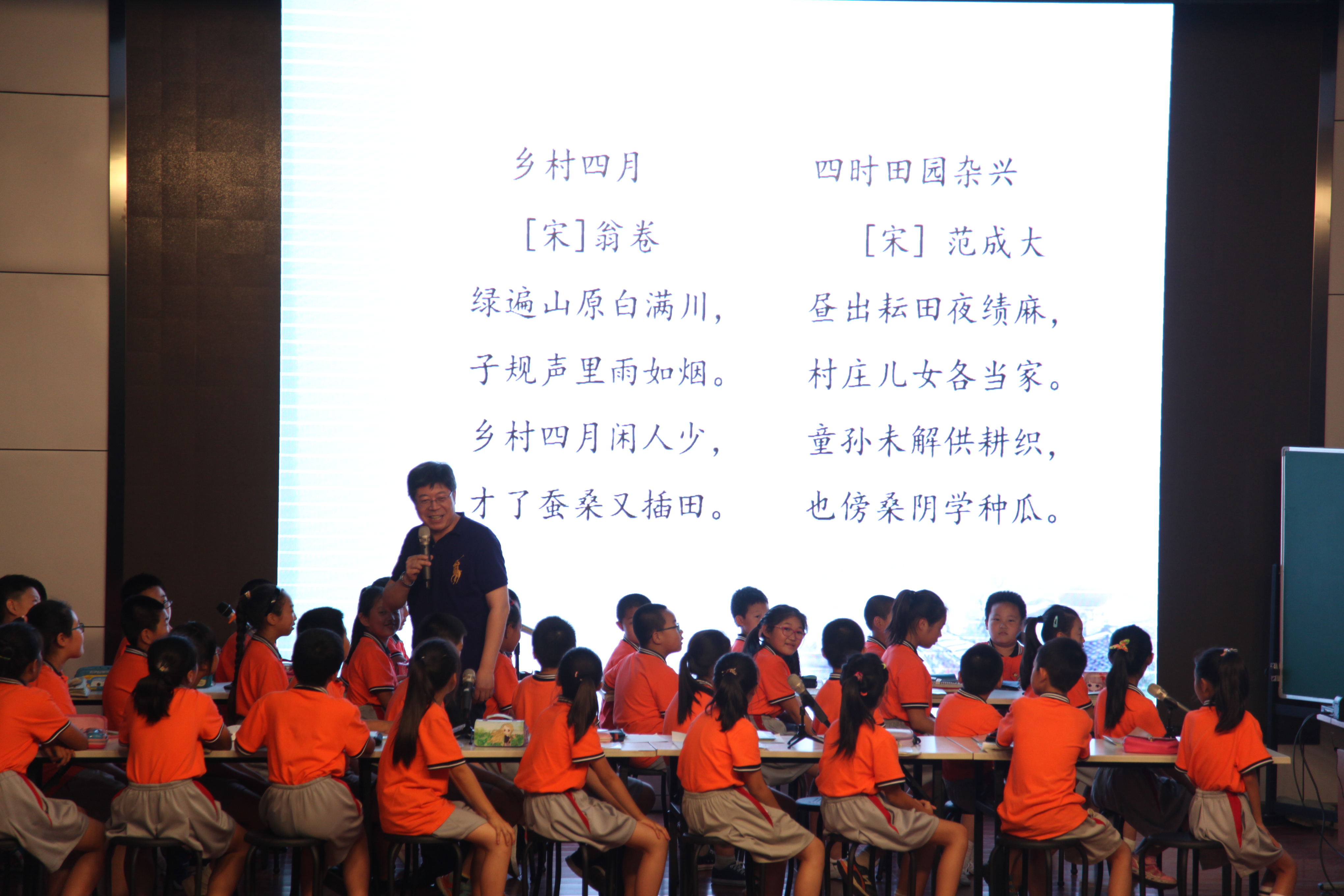 首先,由工作室导师张立军老师执教人教版语文四年级下册《乡村四月》和《四时田园杂兴》田园诗两首。课堂上,张老师聚焦两首诗的共同点,同中思异,异中悟同,借助联想、想象,描绘诗词画面,感受诗词意境,体会诗词情感。张老师扎实的课风,对课堂上生成性资源的巧妙引导,让学生收获知识的同时,获得思维的发展,传统文化的熏陶。